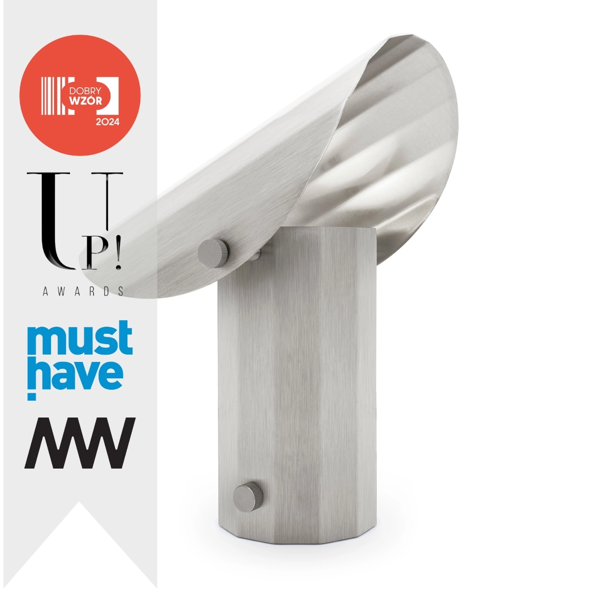 Apolin table lamp grynasz Studio project it's made of steel standing lamp, inspired by designs created at the Polish metal works MEOS and ZAOS in the 1950s-70s. Lamp with dimensions of 30 x 30 x 11.5 cm and power of 9W LED - the larger of the two available versions - is characterized by a movable faceted canopy and base made of of brushed steel. Thus, the lamp is part of one of the hottest trends in interiors and will look great in Brutalist interiors, cafes and restaurants, where there is no shortage of noble materials and elements in this type of finish.