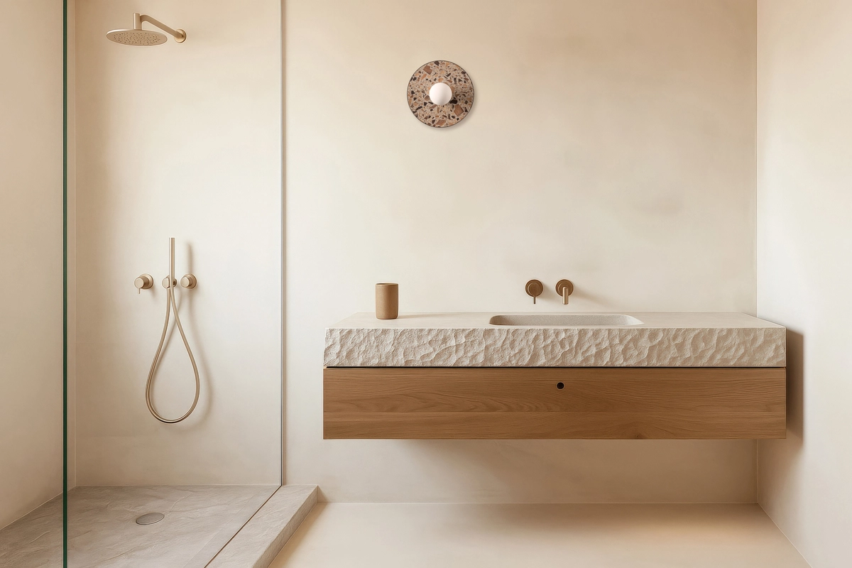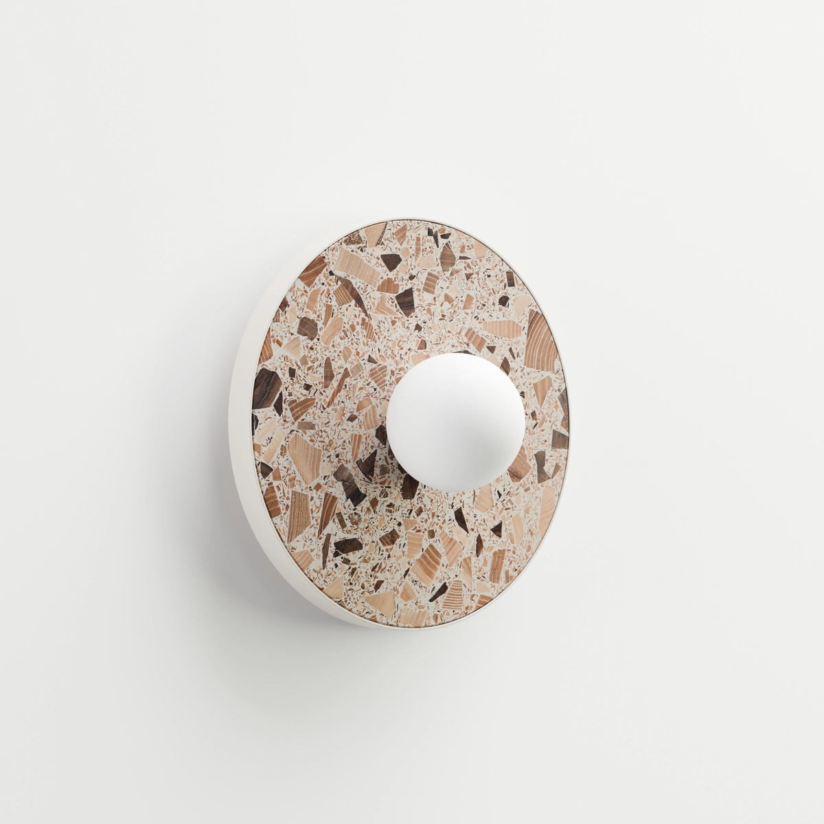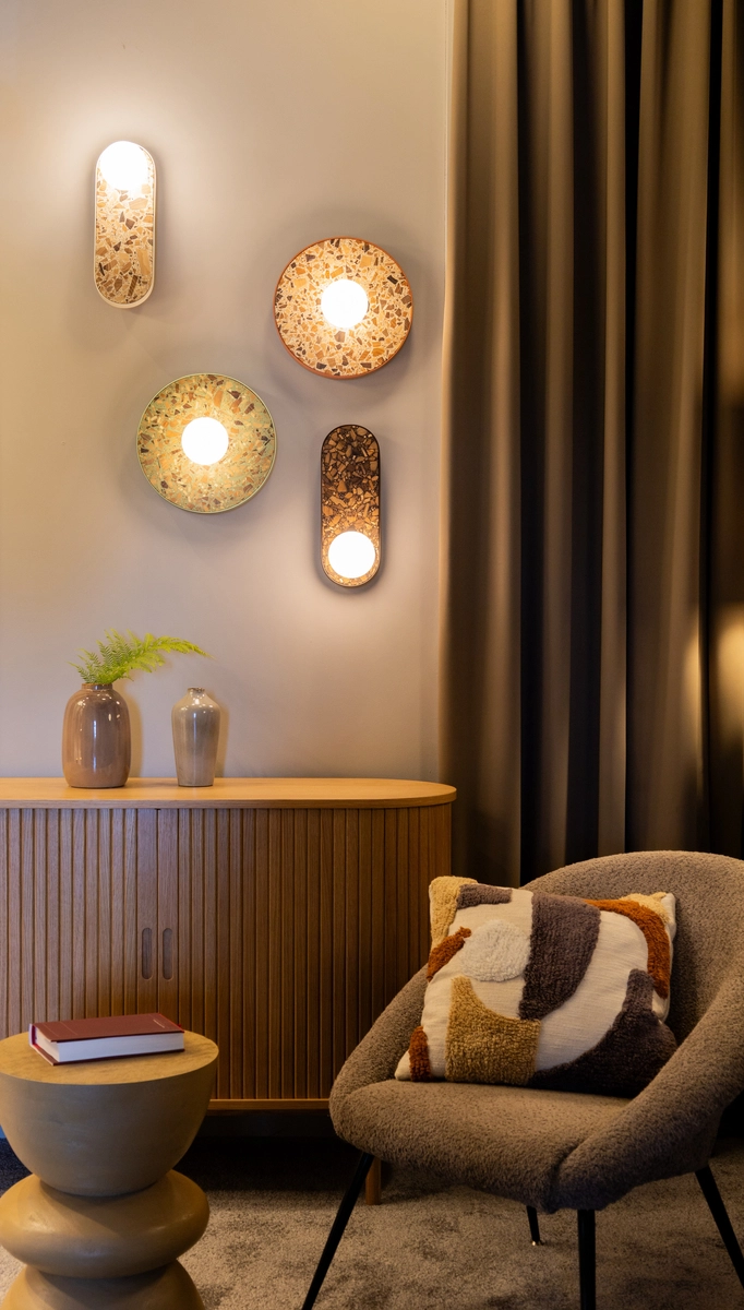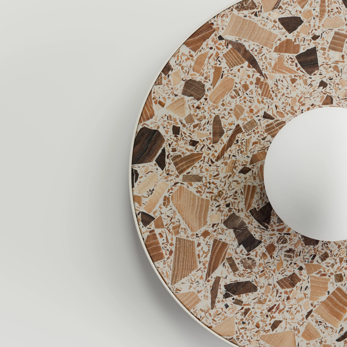 The base of all luminaires in the collection is the unique terrazzo "Full of Tradition" - a material developed by HANK, a Polish studio specialising in responsible design. This terrazzo is made from wood fragments embedded in resin: ash wood, walnut and fruit trees. Each fragment was selected individually and the result is a noble, unique mosaic. The wood has not been hidden - on the contrary, its cross-section and grain pattern are fully visible and become an integral part of the composition.