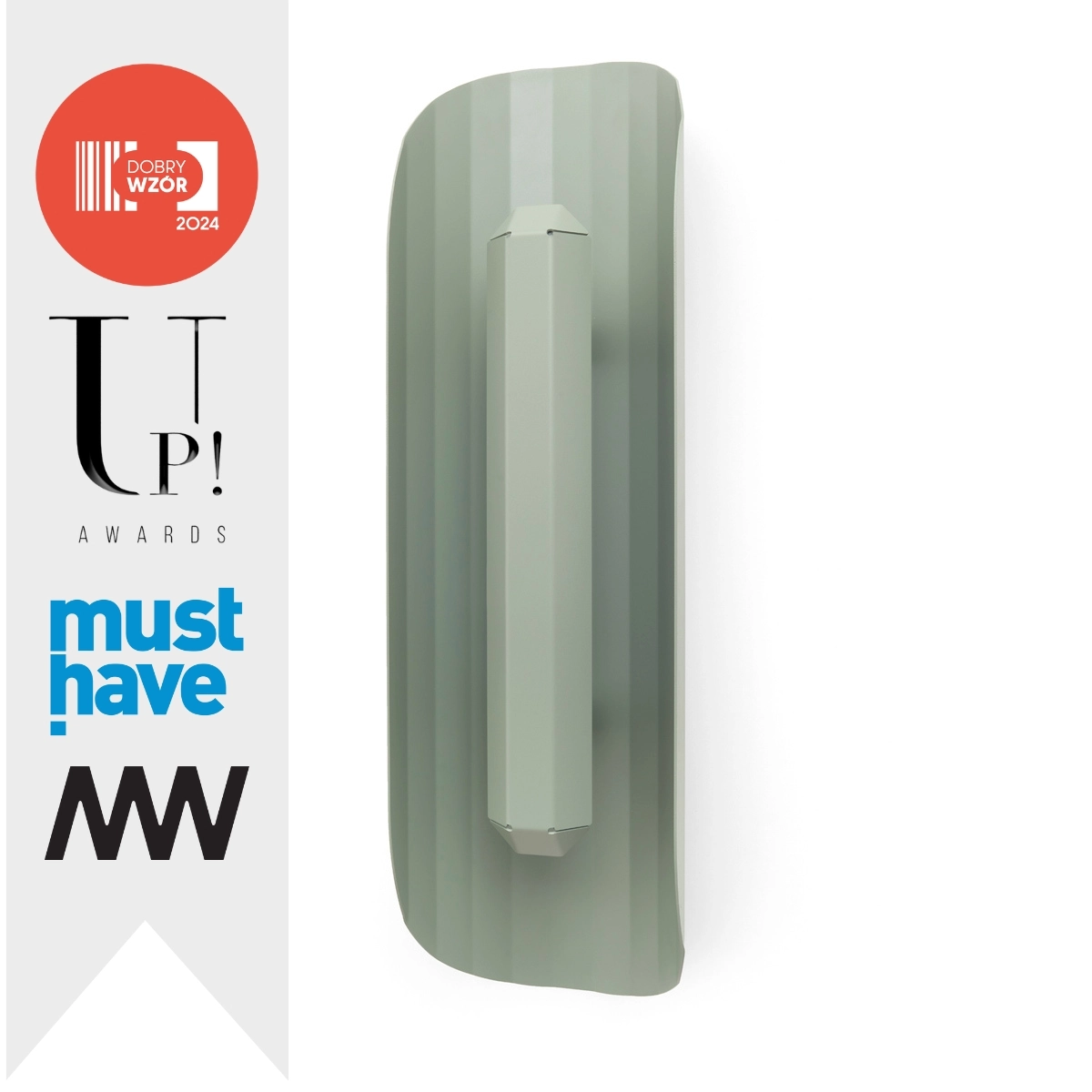 Kinkiet Apolin projektu Grynasz Studio w pięknym, zielonym kolorze w odcieniu szałwi, to wykonana z metalu lampa ścienna, inspirowana projektami tworzonymi w polskich zakładach metalowych MEOS i ZAOS w latach 50-70 XX wieku. Lampa o wymiarach 65 x 19 x 16,5 cm i mocy 25W LED – mniejsza z dwóch dostępnych wersji - charakteryzuje się profilowaną, fasetkową czaszą, wygiętą w taki sposób, by obejmowała niejako źródło światła.