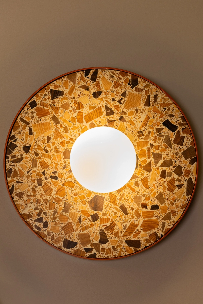 Bazą wszystkich opraw z kolekcji jest unikalne terrazzo "Full of Tradition" – materiał opracowany przez HANK, polską pracownię specjalizującą się w odpowiedzialnym projektowaniu. Terrazzo to wykonano z zatopionych w żywicy fragmentów drewna: drewna jesionu, orzecha włoskiego i drzew owocowych. Każdy fragment wybrano indywidualnie, a efekt to szlachetna, niepowtarzalna mozaika. Drewno nie zostało ukryte – przeciwnie, jego przekrój i rysunek słojów są w pełni widoczne i stają się integralnym elementem kompozycji.
