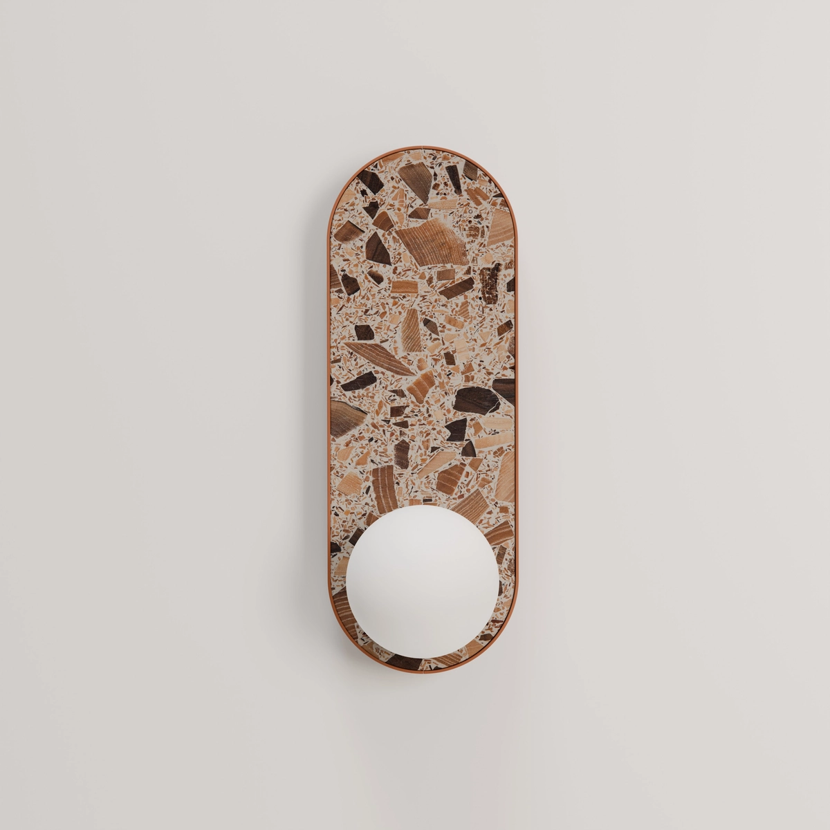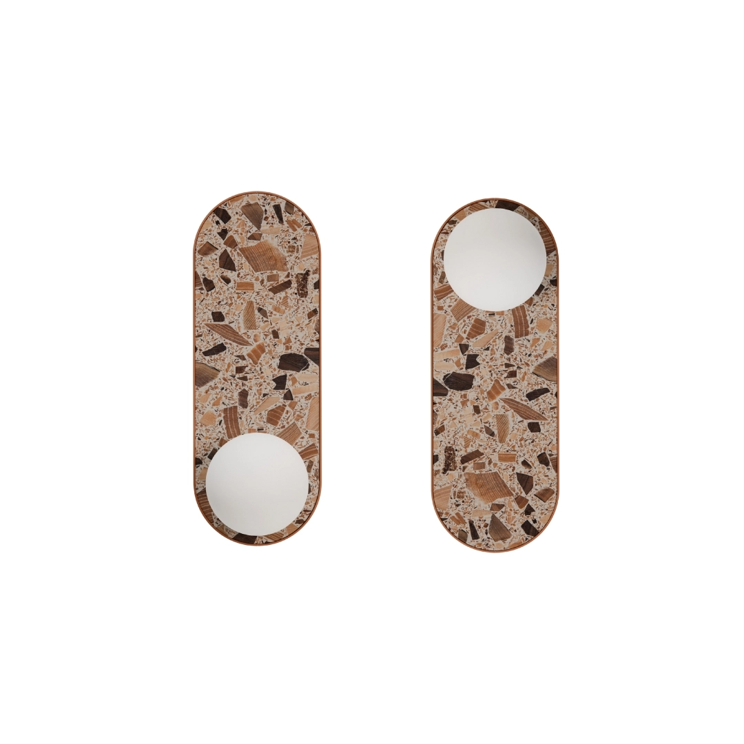 Bazą wszystkich opraw z kolekcji jest unikalne terrazzo "Full of Tradition" – materiał opracowany przez HANK, polską pracownię specjalizującą się w odpowiedzialnym projektowaniu. Terrazzo to wykonano z zatopionych w żywicy fragmentów drewna: drewna jesionu, orzecha włoskiego i drzew owocowych. Każdy fragment wybrano indywidualnie, a efekt to szlachetna, niepowtarzalna mozaika. Drewno nie zostało ukryte – przeciwnie, jego przekrój i rysunek słojów są w pełni widoczne i stają się integralnym elementem kompozycji.