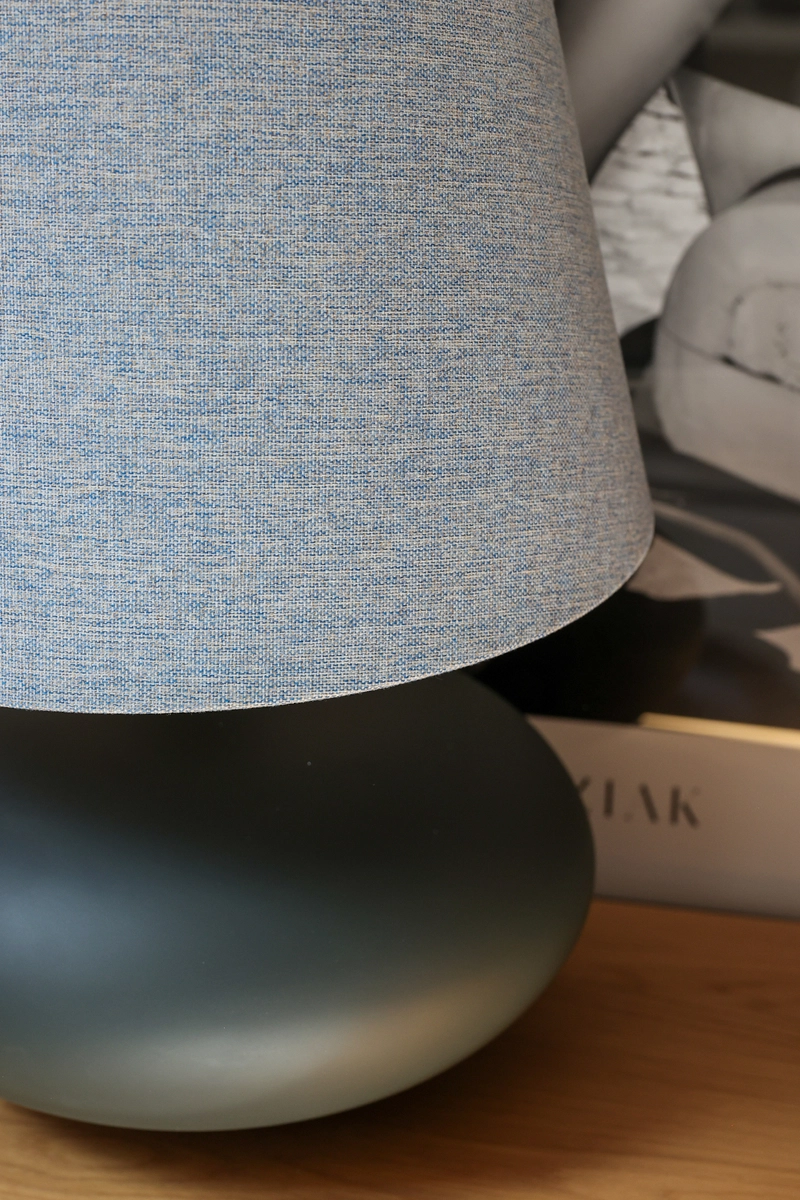 Abażur w melanżowym błękicie został uszyty ręcznie z wysokogatunkowej tkaniny. Od wewnątrz wykończony jest naturalną, bawełnianą warstwą podszycia, która delikatnie rozprasza światło i tworzy przytulną aurę. Co istotne – abażur nie jest zakończony powszechnie stosowaną lamówką, lecz elegancką przewijką, co świadczy o starannym, ręcznym wykończeniu i podkreśla wysoką jakość wykonania.