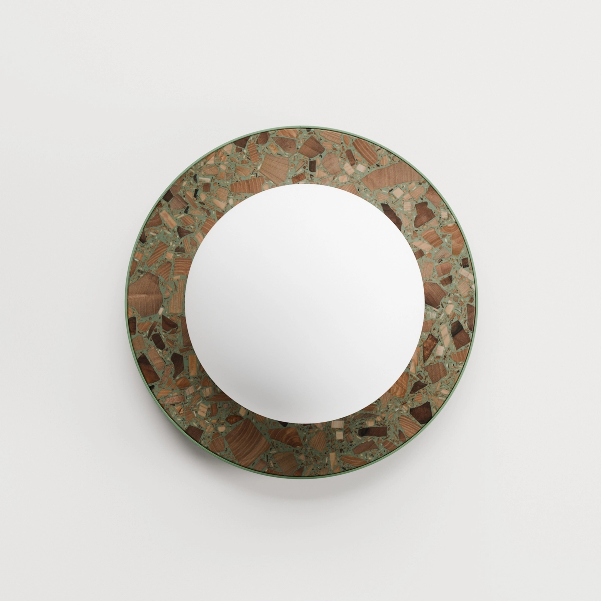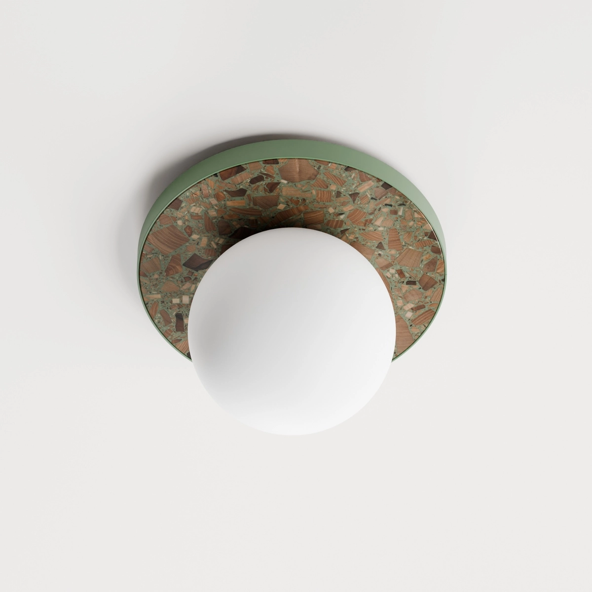 Bazą wszystkich opraw z kolekcji jest unikalne terrazzo "Full of Tradition" – materiał opracowany przez HANK, polską pracownię specjalizującą się w odpowiedzialnym projektowaniu. Terrazzo to wykonano z zatopionych w żywicy fragmentów drewna: drewna jesionu, orzecha włoskiego i drzew owocowych. Każdy fragment wybrano indywidualnie, a efekt to szlachetna, niepowtarzalna mozaika. Drewno nie zostało ukryte – przeciwnie, jego przekrój i rysunek słojów są w pełni widoczne i stają się integralnym elementem kompozycji.
