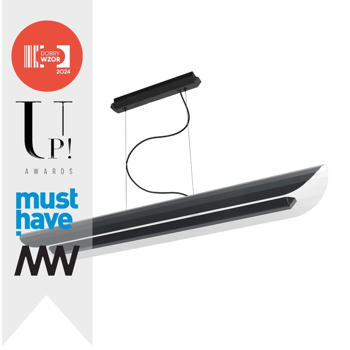 Підвісний світильник Apolin проект Grynasz Studio є легким у своїй експресії, хоча з металу, лінійний світильник довжиною 120 см. Натхненний дизайнами, створеними на польських металургійних заводах MEOS та ZAOS у 1950-70-х роках, він характеризується видовжена, м'яко закруглена, гранована чаша зроблений виготовлений з профільованої нержавіючої сталі товщиною 1,5 мм, з порошковим покриттям чорного кольору ззовні та білого кольору зсередини.